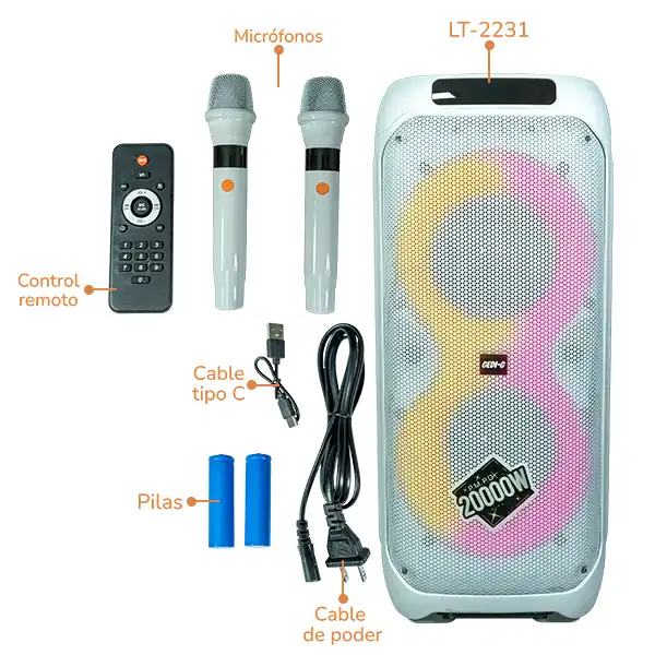 El Parlante LT 2231 Para Karaoke es la elección perfecta para quienes buscan potencia real, sonido envolvente y entretenimiento completo en un solo equipo. Sus 100W RMS y doble parlante de 8 pulgadas ofrecen un audio fuerte, claro y con graves contundentes, capaz de animar cualquier reunión, fiesta o evento sin necesidad de equipos adicionales.