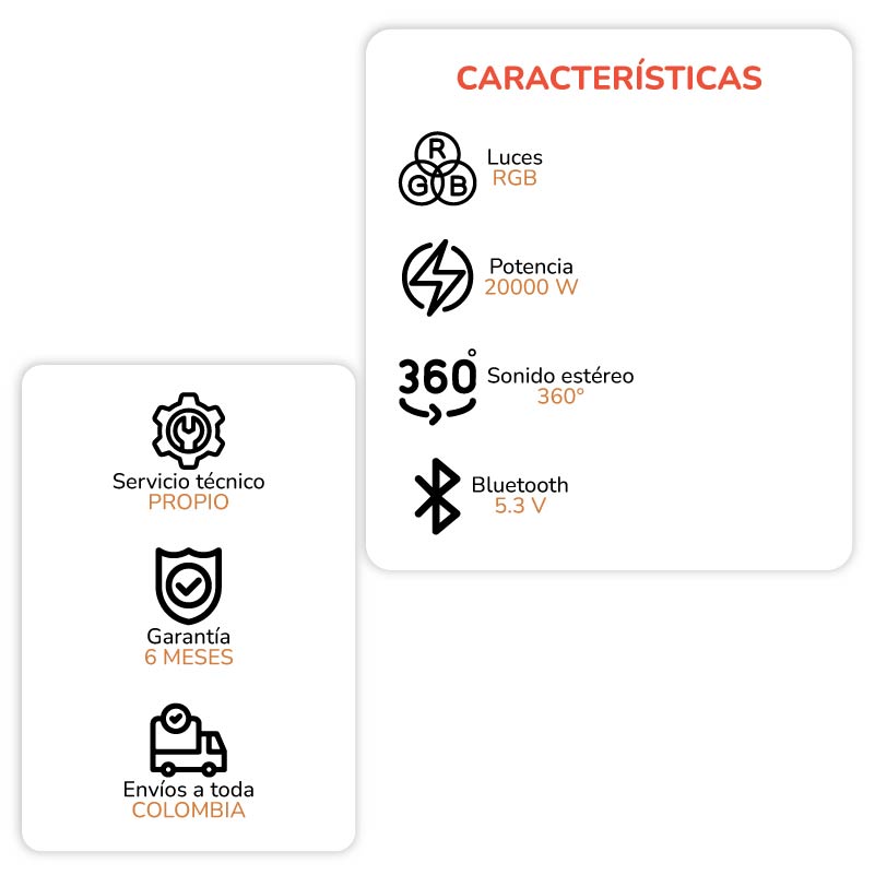 Gracias a sus múltiples opciones de conectividad (USB, TF, AUX y conexión inalámbrica), puedes reproducir música desde diferentes dispositivos, adaptándose a cualquier necesidad. Las luces RGB integradas aportan un ambiente visual dinámico que eleva la experiencia de fiesta y hace que cada evento sea más divertido.