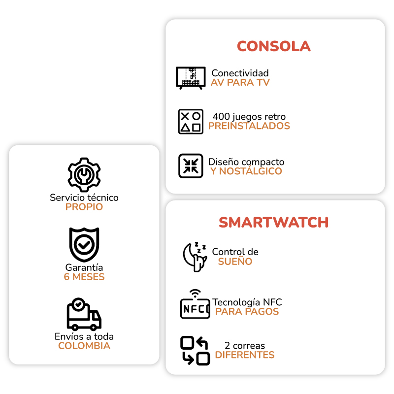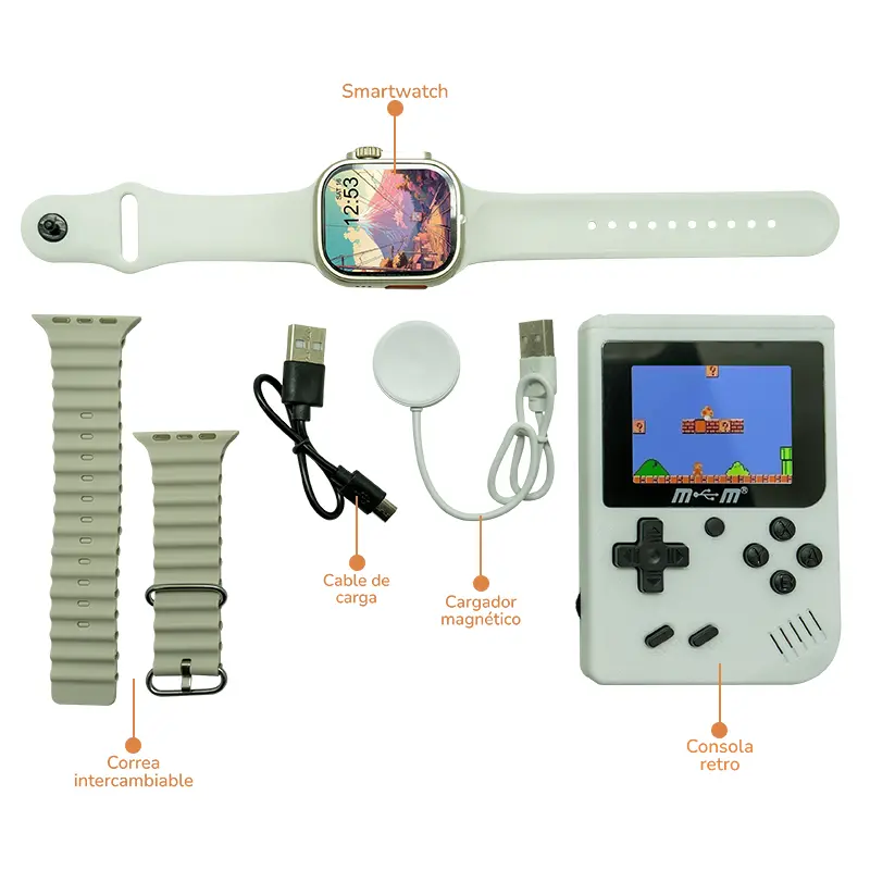 El Combo Smart Watch V59 Con Consola Retro es una opción excepcional para sorprender en comuniones, navidad, cumpleaños, grados o cualquier ocasión especial, ya que combina tecnología útil para el día a día con entretenimiento clásico que nunca pasa de moda. Su mayor atractivo es que incluye dos productos de gran valor: un reloj inteligente, moderno, elegante y funcional, junto a una consola retro con 400 juegos que despiertan nostalgia y brindan horas de diversión.